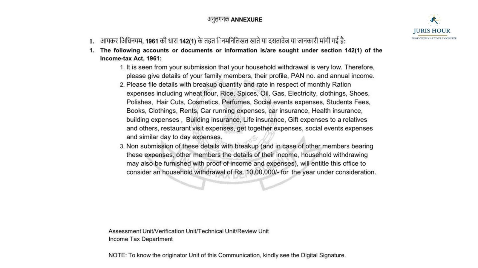 While Section 142(1) empowers the Department to call for information during assessment, practitioners note that such granular questioning on personal living expenses — especially grooming products like perfumes and haircuts — reflects an upgraded approach where lifestyle patterns are being closely matched with reported income.