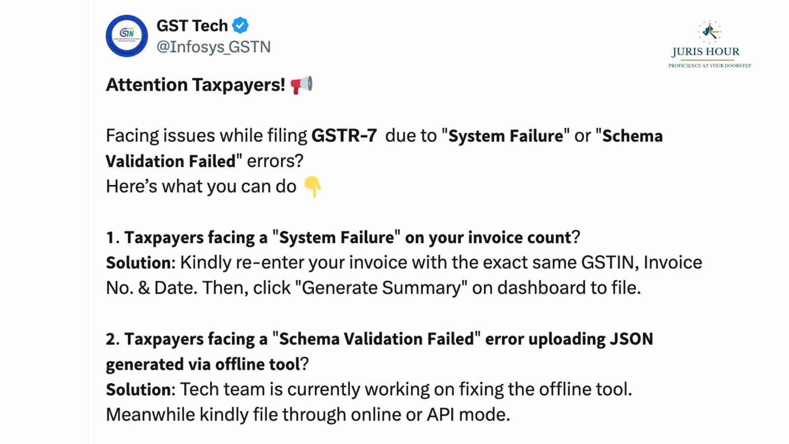 Taxpayers filing GSTR-7 have reported persistent issues on the GST portal, encountering messages such as “System Failure” or “Schema Validation Failed” while attempting to upload their returns. The Goods and Services Tax Network (GSTN) has acknowledged these errors and shared temporary workarounds to help users proceed with filing.