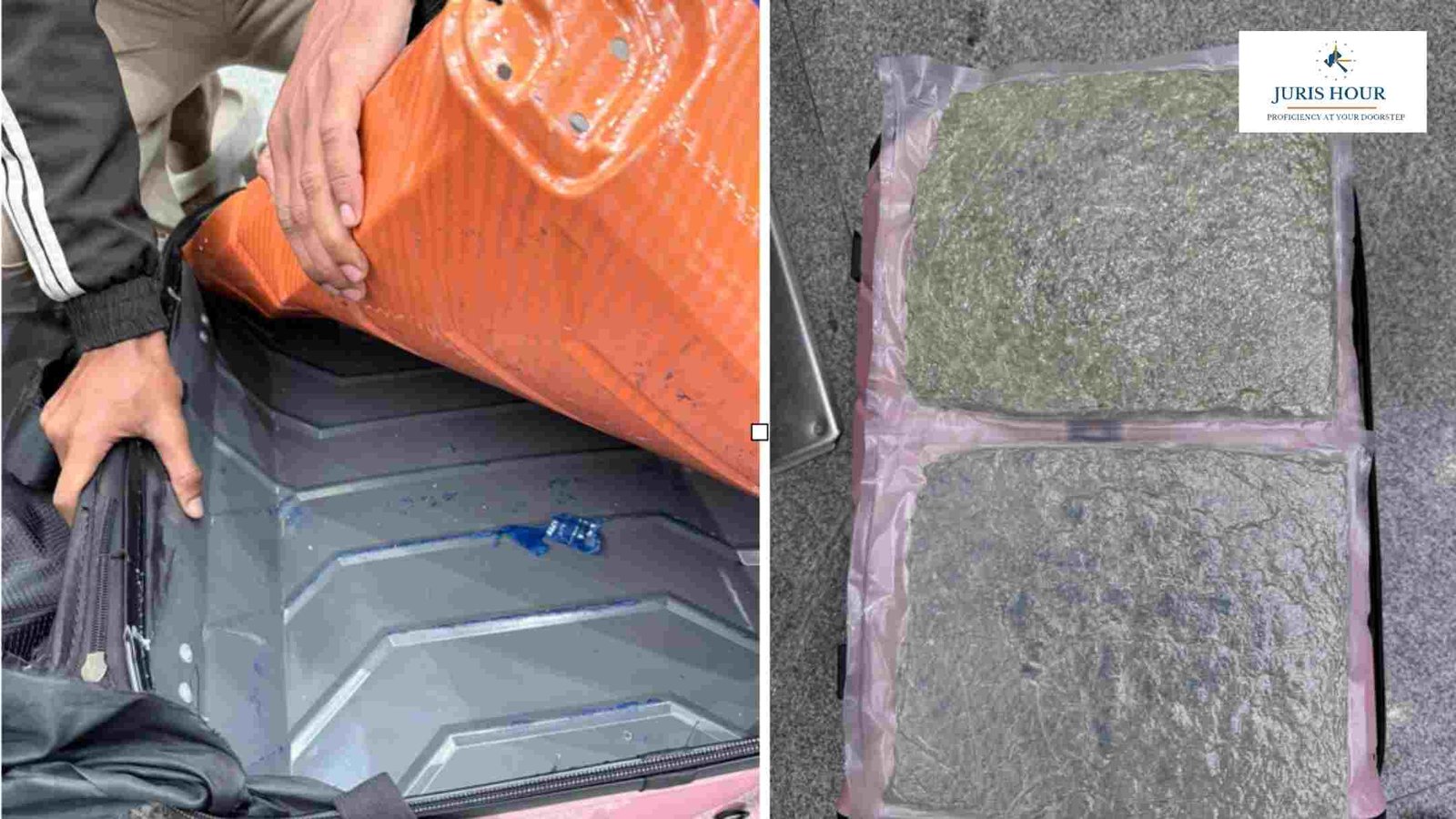 The remaining 2 packets were found secreted within the false bottom of the carry-on luggage. These packets had been concealed by converting the suspected contraband into paste form and hydraulically pressing it to enable seamless placement within the false compartment. The false bottom was subsequently prised open, leading to the recovery of the suspected contraband. On testing, the substance gave a positive result for Cannabis. A total of 3.93 kg of hydroponic weed was recovered from the baggage.