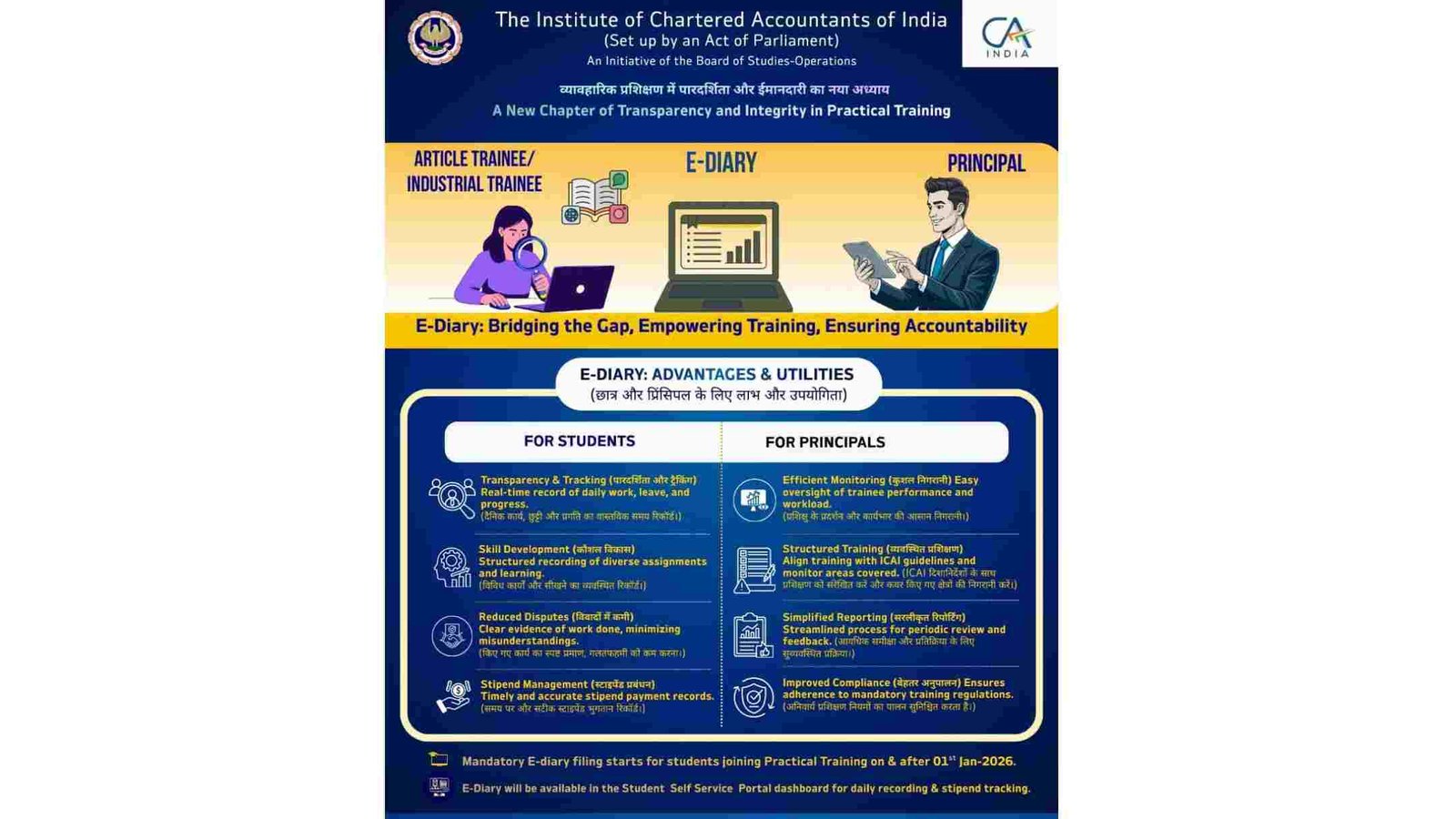 ICAI has clarified that E-Diary filing will be mandatory only for students who commence practical training on or after January 1, 2026. Students already undergoing training before this date may continue under the existing framework unless further instructions are issued.