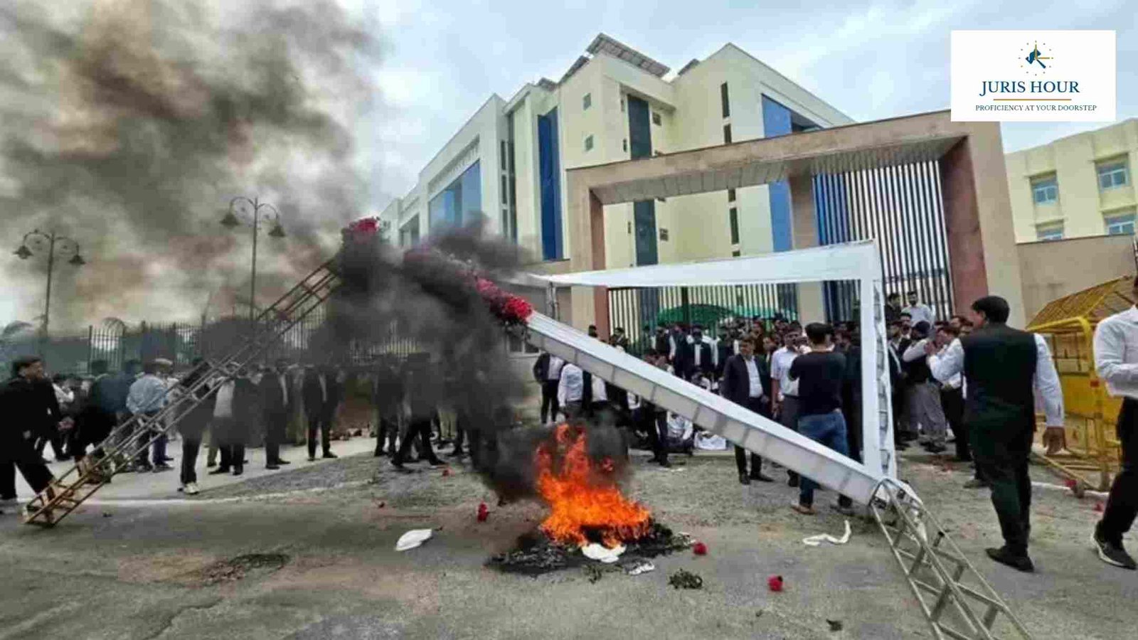 A major controversy erupted in Ajmer on Wednesday when a group of lawyers, expressing their anger over inadequate facilities in the newly constructed district court complex, set fire to decorations during the inauguration ceremony. The incident took place even as Acting Chief Justice of the Rajasthan High Court, Justice Sanjeev Sharma, was present at the venue for the official opening.